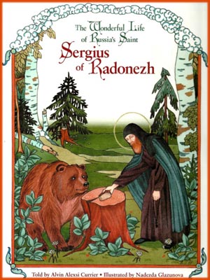 In the year 2000 when the Russian folk artist, Nadezdah Glazunova asked her spiritual father for a blessing to illustrate a third children’s book with Alvin Alexsi Currier, the priest gently refused her, giving her instead the obedience to illustrate the life of Saint Sergius for the children of the world. This was a daunting challenge for every detail of the Saint’s life was widely known in the Slavic world and every incident was already illustrated by great masters whose paintings had become iconic for the incidents. Nadezda prayed and painted. Alexsi attempted to draft a text worthy of her amazing art. Together we offer here the blessed result.